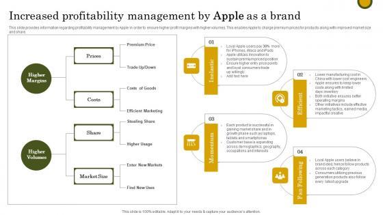 This slide provides information regarding profitability management by Apple in order to ensure higher profit margins with higher volumes. This enables Apple to charge premium prices for products along with improved market size and share. Retrieve professionally designed Increased Profitability Management Apple Branding Strategy To Become Market Leader Diagrams Pdf to effectively convey your message and captivate your listeners. Save time by selecting pre made slideshows that are appropriate for various topics, from business to educational purposes. These themes come in many different styles, from creative to corporate, and all of them are easily adjustable and can be edited quickly. Access them as PowerPoint templates or as Google Slides themes. You do not have to go on a hunt for the perfect presentation because Slidegeeks got you covered from everywhere. This slide provides information regarding profitability management by Apple in order to ensure higher profit margins with higher volumes. This enables Apple to charge premium prices for products along with improved market size and share.