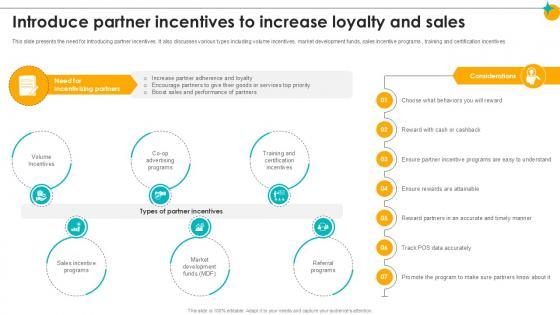 This slide presents the need for introducing partner incentives. It also discusses various types including volume incentives, market development funds, sales incentive programs , training and certification incentives. Crafting an eye-catching presentation has never been more straightforward. Let your presentation shine with this tasteful yet straightforward Introduce Partner Incentives To Increase Loyalty And Sales Partner Relationship Ppt Template template. It offers a minimalistic and classy look that is great for making a statement. The colors have been employed intelligently to add a bit of playfulness while still remaining professional. Construct the ideal Introduce Partner Incentives To Increase Loyalty And Sales Partner Relationship Ppt Template that effortlessly grabs the attention of your audience Begin now and be certain to wow your customers This slide presents the need for introducing partner incentives. It also discusses various types including volume incentives, market development funds, sales incentive programs , training and certification incentives.