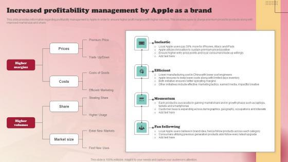This slide provides information regarding profitability management by Apple in order to ensure higher profit margins with higher volumes. This enables Apple to charge premium prices for products along with improved market size and share.The best PPT templates are a great way to save time, energy, and resources. Slidegeeks have 100Precent editable powerpoint slides making them incredibly versatile. With these quality presentation templates, you can create a captivating and memorable presentation by combining visually appealing slides and effectively communicating your message. Download Product Branding Strategy Of Apple Increased Profitability Management By Apple Ideas Pdf from Slidegeeks and deliver a wonderful presentation. This slide provides information regarding profitability management by Apple in order to ensure higher profit margins with higher volumes. This enables Apple to charge premium prices for products along with improved market size and share.