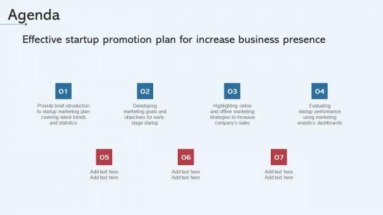 Boost your pitch with our creative Agenda Effective Startup Promotion Plan For Increase Business Presence Information Pdf. Deliver an awe inspiring pitch that will mesmerize everyone. Using these presentation templates you will surely catch everyones attention. You can browse the ppts collection on our website. We have researchers who are experts at creating the right content for the templates. So you do not have to invest time in any additional work. Just grab the template now and use them. Our Agenda Effective Startup Promotion Plan For Increase Business Presence Information Pdf are topically designed to provide an attractive backdrop to any subject. Use them to look like a presentation pro.