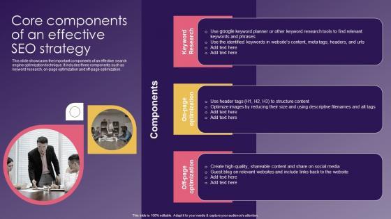 This slide showcases the important components of an effective search engine optimization technique. It includes three components such as keyword research, on page optimization and off page optimization. There are so many reasons you need a Core Components Effective SEO School Promotion Strategies To Increase Enrollment Background Pdf. The first reason is you can not spend time making everything from scratch, Thus, Slidegeeks has made presentation templates for you too. You can easily download these templates from our website easily. This slide showcases the important components of an effective search engine optimization technique. It includes three components such as keyword research, on page optimization and off page optimization.