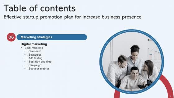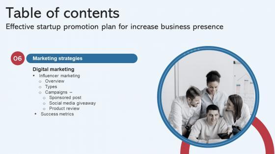Do you have an important presentation coming up Are you looking for something that will make your presentation stand out from the rest Look no further than Effective Startup Promotion Plan For Increase Table Of Contents Template Pdf. With our professional designs, you can trust that your presentation will pop and make delivering it a smooth process. And with Slidegeeks, you can trust that your presentation will be unique and memorable. So why wait Grab Effective Startup Promotion Plan For Increase Table Of Contents Template Pdf today and make your presentation stand out from the rest. Our Effective Startup Promotion Plan For Increase Table Of Contents Template Pdf are topically designed to provide an attractive backdrop to any subject. Use them to look like a presentation pro.