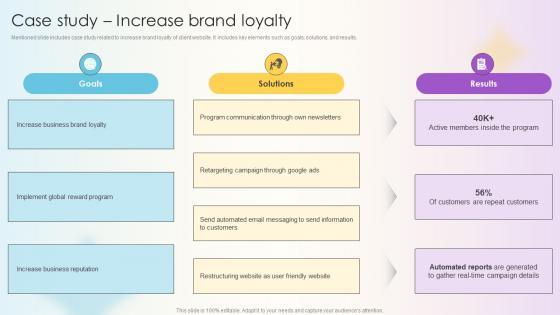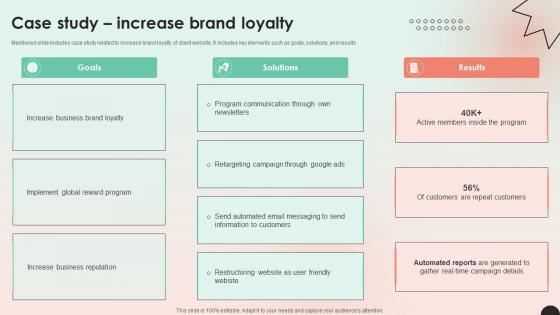 Mentioned slide includes case study related to increase brand loyalty of client website. It includes key elements such as goals, solutions, and results. Get a simple yet stunning designed Web Consulting Business Performance Case Study Increase Brand Loyalty. It is the best one to establish the tone in your meetings. It is an excellent way to make your presentations highly effective. So, download this PPT today from Slidegeeks and see the positive impacts. Our easy-to-edit Web Consulting Business Performance Case Study Increase Brand Loyalty can be your go-to option for all upcoming conferences and meetings. So, what are you waiting for Grab this template today. Mentioned slide includes case study related to increase brand loyalty of client website. It includes key elements such as goals, solutions, and results.