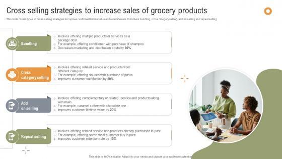 This slide covers types of cross selling strategies to improve customer lifetime value and retention rate. It involves bundling, cross category selling, add on selling and repeat selling. Present like a pro with Marketing Strategies For Effective Cross Selling Strategies To Increase Sales Of Grocery. Create beautiful presentations together with your team, using our easy-to-use presentation slides. Share your ideas in real-time and make changes on the fly by downloading our templates. So whether you are in the office, on the go, or in a remote location, you can stay in sync with your team and present your ideas with confidence. With Slidegeeks presentation got a whole lot easier. Grab these presentations today. This slide covers types of cross selling strategies to improve customer lifetime value and retention rate. It involves bundling, cross category selling, add on selling and repeat selling.
