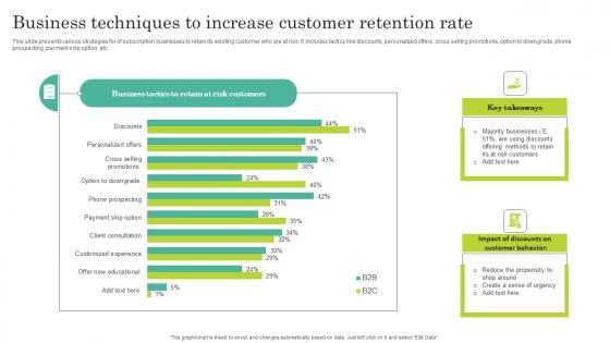 This slide presents various strategies for of subscription businesses to retain its existing customer who are at risk. It includes tactics like discounts, personalized offers, cross selling promotions, option to downgrade, phone prospecting, payment skip option, etc. Showcasing this set of slides titled Business Techniques To Increase Customer Retention Rate Slides Pdf. The topics addressed in these templates are Majority Businesses, Offering Methods Retain, Reduce Propensity. All the content presented in this PPT design is completely editable. Download it and make adjustments in color, background, font etc. as per your unique business setting. This slide presents various strategies for of subscription businesses to retain its existing customer who are at risk. It includes tactics like discounts, personalized offers, cross selling promotions, option to downgrade, phone prospecting, payment skip option, etc.