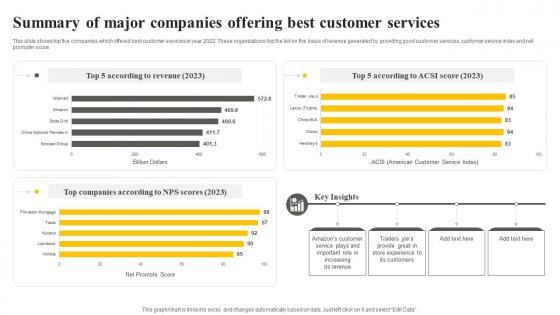 This slide shows top five companies which offered best customer services in year 2022. These organizations top the list on the basis of revenue generated by providing good customer services, customer service index and net promoter score. Presenting this PowerPoint presentation, titled Client Support Plan To Increase Customer Summary Of Major Companies Offering Best Customer Strategy SS V, with topics curated by our researchers after extensive research. This editable presentation is available for immediate download and provides attractive features when used. Download now and captivate your audience. Presenting this Client Support Plan To Increase Customer Summary Of Major Companies Offering Best Customer Strategy SS V. Our researchers have carefully researched and created these slides with all aspects taken into consideration. This is a completely customizable Client Support Plan To Increase Customer Summary Of Major Companies Offering Best Customer Strategy SS V that is available for immediate downloading. Download now and make an impact on your audience. Highlight the attractive features available with our PPTs. This slide shows top five companies which offered best customer services in year 2022. These organizations top the list on the basis of revenue generated by providing good customer services, customer service index and net promoter score.