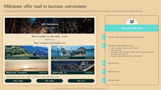 This slide represents details related to one of the types of emails to be sent by travel organizations in order to engage customers and increase conversion rate. It includes details related to milestone offer mail. Get a simple yet stunning designed Guide To Winning Tourism Milestone Offer Mail To Increase Conversions Introduction Pdf It is the best one to establish the tone in your meetings. It is an excellent way to make your presentations highly effective. So, download this PPT today from Slidegeeks and see the positive impacts. Our easy-to-edit Guide To Winning Tourism Milestone Offer Mail To Increase Conversions Introduction Pdf can be your go-to option for all upcoming conferences and meetings. So, what are you waiting for Grab this template today. This slide represents details related to one of the types of emails to be sent by travel organizations in order to engage customers and increase conversion rate. It includes details related to milestone offer mail.