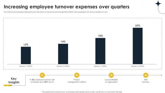 This slide shows increasing employee turnover rates due to increase in project management conflicts in the organization over the four quarters in a year Formulating a presentation can take up a lot of effort and time, so the content and message should always be the primary focus. The visuals of the PowerPoint can enhance the presenters message, so our Increasing Employee Turnover Expenses Over Implementing Personnel Downsizing Initiative was created to help save time. Instead of worrying about the design, the presenter can concentrate on the message while our designers work on creating the ideal templates for whatever situation is needed. Slidegeeks has experts for everything from amazing designs to valuable content, we have put everything into Increasing Employee Turnover Expenses Over Implementing Personnel Downsizing Initiative This slide shows increasing employee turnover rates due to increase in project management conflicts in the organization over the four quarters in a year