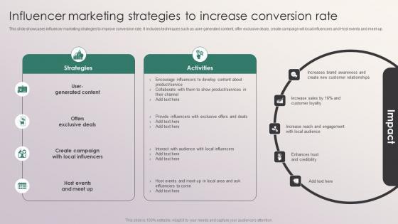 This slide showcases influencer marketing strategies to improve conversion rate. It includes techniques such as user generated content, offer exclusive deals, create campaign wit local influencers and Host events and meet up. Coming up with a presentation necessitates that the majority of the effort goes into the content and the message you intend to convey. The visuals of a PowerPoint presentation can only be effective if it supplements and supports the story that is being told. Keeping this in mind our experts created Influencer Marketing Strategies To Increase Conversion Rate Penetrating Markets With Financial Strategy SS V to reduce the time that goes into designing the presentation. This way, you can concentrate on the message while our designers take care of providing you with the right template for the situation. This slide showcases influencer marketing strategies to improve conversion rate. It includes techniques such as user generated content, offer exclusive deals, create campaign wit local influencers and Host events and meet up.