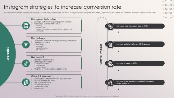 This slide showcases the Instagram strategies to increase lead conversion rate. It includes strategies such as user generated content, use Hashtags, live content and contests and giveaways and its positive impact. This modern and well arranged Instagram Strategies To Increase Conversion Rate Penetrating Markets With Financial Strategy SS V provides lots of creative possibilities. It is very simple to customize and edit with the Powerpoint Software. Just drag and drop your pictures into the shapes. All facets of this template can be edited with Powerpoint, no extra software is necessary. Add your own material, put your images in the places assigned for them, adjust the colors, and then you can show your slides to the world, with an animated slide included. This slide showcases the Instagram strategies to increase lead conversion rate. It includes strategies such as user generated content, use Hashtags, live content and contests and giveaways and its positive impact.