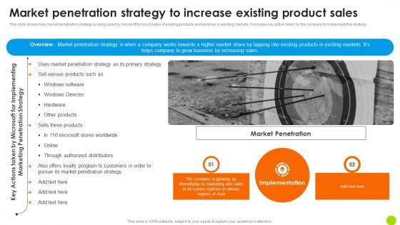 This slide shows how market penetration strategy is being used by microsoft to boost sales of existing products and services in existing markets. It includes key action taken by the company to implement this strategy. From laying roadmaps to briefing everything in detail, our templates are perfect for you. You can set the stage with your presentation slides. All you have to do is download these easy-to-edit and customizable templates. Microsoft Strategic Plan To Become Market Leader Market Penetration Strategy To Increase Existing Product Sales Topics PDF will help you deliver an outstanding performance that everyone would remember and praise you for. Do download this presentation today.