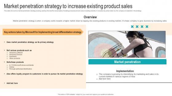 This slide shows how market penetration strategy is being used by microsoft to boost sales of existing products and services in existing markets. It includes key action taken by the company to implement this strategy. The best PPT templates are a great way to save time, energy, and resources. Slidegeeks have 100 percent editable powerpoint slides making them incredibly versatile. With these quality presentation templates, you can create a captivating and memorable presentation by combining visually appealing slides and effectively communicating your message. Download Micosoft Intensive Growth Market Penetration Strategy To Increase Existing Product Sales Strategy SS V from Slidegeeks and deliver a wonderful presentation. This slide shows how market penetration strategy is being used by microsoft to boost sales of existing products and services in existing markets. It includes key action taken by the company to implement this strategy.