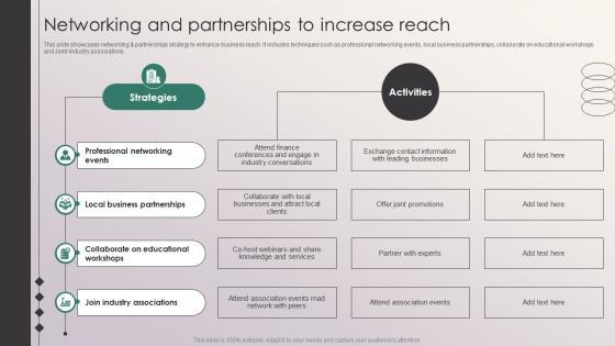 This slide showcases networking and partnerships strategy to enhance business reach. It includes techniques such as professional networking events, local business partnerships, collaborate on educational workshops and Joint industry associations. Retrieve professionally designed Networking And Partnerships To Increase Reach Penetrating Markets With Financial Strategy SS V to effectively convey your message and captivate your listeners. Save time by selecting pre made slideshows that are appropriate for various topics, from business to educational purposes. These themes come in many different styles, from creative to corporate, and all of them are easily adjustable and can be edited quickly. Access them as PowerPoint templates or as Google Slides themes. You do not have to go on a hunt for the perfect presentation because Slidegeeks got you covered from everywhere. This slide showcases networking and partnerships strategy to enhance business reach. It includes techniques such as professional networking events, local business partnerships, collaborate on educational workshops and Joint industry associations.