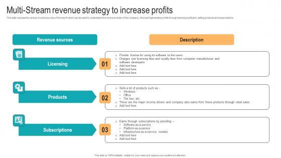This slide represents various income sources of Microsoft which can be used to understand the revenue model of the company. Microsoft generates profits through licensing software, selling products and subscriptions. Here you can discover an assortment of the finest PowerPoint and Google Slides templates. With these templates, you can create presentations for a variety of purposes while simultaneously providing your audience with an eye-catching visual experience. Download Multi Stream Revenue Strategy To Increase Profits Strategic Advancements By Microsofts Elements Pdf to deliver an impeccable presentation. These templates will make your job of preparing presentations much quicker, yet still, maintain a high level of quality. Slidegeeks has experienced researchers who prepare these templates and write high-quality content for you. Later on, you can personalize the content by editing the Multi Stream Revenue Strategy To Increase Profits Strategic Advancements By Microsofts Elements Pdf. This slide represents various income sources of Microsoft which can be used to understand the revenue model of the company. Microsoft generates profits through licensing software, selling products and subscriptions.