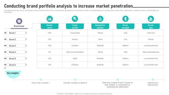 This slide helps develop, launch, and manage numerous brands within a firm to increase market penetration and reduce brand overlap. It includes aspects such as brand name, market share, target market, competitive position, brand strength, and brand types. If you are looking for a format to display your unique thoughts, then the professionally designed Brand Equity Management To Raise Conducting Brand Portfolio Analysis To Increase is the one for you. You can use it as a Google Slides template or a PowerPoint template. Incorporate impressive visuals, symbols, images, and other charts. Modify or reorganize the text boxes as you desire. Experiment with shade schemes and font pairings. Alter, share or cooperate with other people on your work. Download Brand Equity Management To Raise Conducting Brand Portfolio Analysis To Increase and find out how to give a successful presentation. Present a perfect display to your team and make your presentation unforgettable. This slide helps develop, launch, and manage numerous brands within a firm to increase market penetration and reduce brand overlap. It includes aspects such as brand name, market share, target market, competitive position, brand strength, and brand types.