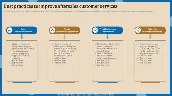 This slide covers various tips to improve aftersales client services, such as seeking customer feedback, creating memorable experiences, providing discounts to customers, and prioritizing customer satisfaction. From laying roadmaps to briefing everything in detail, our templates are perfect for you. You can set the stage with your presentation slides. All you have to do is download these easy to edit and customizable templates. Best Practices To Improve Aftersales Increasing Client Retention Through Efficient Formats Pdf will help you deliver an outstanding performance that everyone would remember and praise you for. Do download this presentation today. This slide covers various tips to improve aftersales client services, such as seeking customer feedback, creating memorable experiences, providing discounts to customers, and prioritizing customer satisfaction.