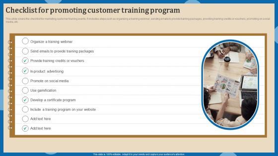 This slide covers the checklist for marketing customer training events. It includes steps such as organizing a training webinar, sending emails to provide training packages, providing training credits or vouchers, promoting on social media, etc. Slidegeeks is here to make your presentations a breeze with Checklist For Promoting Increasing Client Retention Through Efficient Graphics Pdf With our easy to use and customizable templates, you can focus on delivering your ideas rather than worrying about formatting. With a variety of designs to choose from, you are sure to find one that suits your needs. And with animations and unique photos, illustrations, and fonts, you can make your presentation pop. So whether you are giving a sales pitch or presenting to the board, make sure to check out Slidegeeks first. This slide covers the checklist for marketing customer training events. It includes steps such as organizing a training webinar, sending emails to provide training packages, providing training credits or vouchers, promoting on social media, etc.