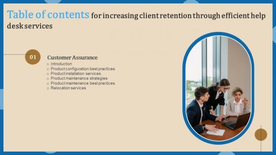 Do you know about Slidesgeeks Table Of Contents For Increasing Client Retention Through Efficient Help Desk Graphics Pdf These are perfect for delivering any kind od presentation. Using it, create PowerPoint presentations that communicate your ideas and engage audiences. Save time and effort by using our pre designed presentation templates that are perfect for a wide range of topic. Our vast selection of designs covers a range of styles, from creative to business, and are all highly customizable and easy to edit. Download as a PowerPoint template or use them as Google Slides themes. Our Table Of Contents For Increasing Client Retention Through Efficient Help Desk Graphics Pdf are topically designed to provide an attractive backdrop to any subject. Use them to look like a presentation pro.