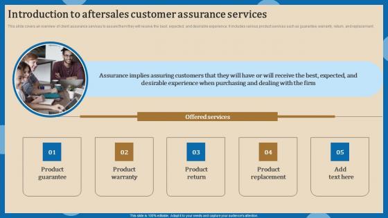 This slide covers an overview of client assurance services to assure them they will receive the best, expected, and desirable experience. It includes various product services such as guarantee, warranty, return, and replacement. Formulating a presentation can take up a lot of effort and time, so the content and message should always be the primary focus. The visuals of the PowerPoint can enhance the presenters message, so our Introduction To Aftersales Increasing Client Retention Through Efficient Introduction Pdf was created to help save time. Instead of worrying about the design, the presenter can concentrate on the message while our designers work on creating the ideal templates for whatever situation is needed. Slidegeeks has experts for everything from amazing designs to valuable content, we have put everything into Introduction To Aftersales Increasing Client Retention Through Efficient Introduction Pdf This slide covers an overview of client assurance services to assure them they will receive the best, expected, and desirable experience. It includes various product services such as guarantee, warranty, return, and replacement.