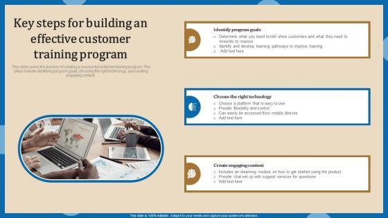 This slide covers the process of creating a successful customer training program. The steps include identifying program goals, choosing the right technology, and creating engaging content. Explore a selection of the finest Key Steps For Building An Effective Increasing Client Retention Through Efficient Sample Pdf here. With a plethora of professionally designed and pre made slide templates, you can quickly and easily find the right one for your upcoming presentation. You can use our Key Steps For Building An Effective Increasing Client Retention Through Efficient Sample Pdf to effectively convey your message to a wider audience. Slidegeeks has done a lot of research before preparing these presentation templates. The content can be personalized and the slides are highly editable. Grab templates today from Slidegeeks. This slide covers the process of creating a successful customer training program. The steps include identifying program goals, choosing the right technology, and creating engaging content.