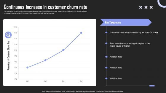 The following slide outlines a comprehensive line chart indicating attrition rate. Information covered in this slide is related to quarterly percentage of customer churn rate along with key takeaways. Whether you have daily or monthly meetings, a brilliant presentation is necessary. Continuous Increase Rate Brand Building Techniques To Gain Competitive Edge Summary Pdf can be your best option for delivering a presentation. Represent everything in detail using Continuous Increase Rate Brand Building Techniques To Gain Competitive Edge Summary Pdf and make yourself stand out in meetings. The template is versatile and follows a structure that will cater to your requirements. All the templates prepared by Slidegeeks are easy to download and edit. Our research experts have taken care of the corporate themes as well. So, give it a try and see the results. The following slide outlines a comprehensive line chart indicating attrition rate. Information covered in this slide is related to quarterly percentage of customer churn rate along with key takeaways.