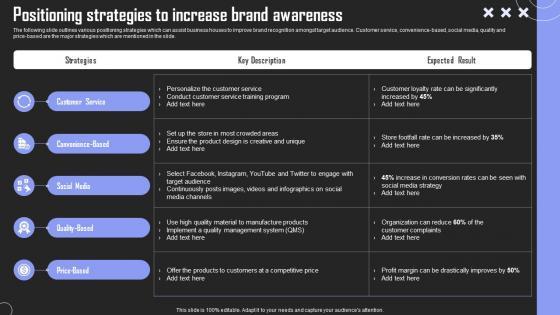 The following slide outlines various positioning strategies which can assist business houses to improve brand recognition amongst target audience. Customer service, convenience based, social media, quality and price based are the major strategies which are mentioned in the slide. Slidegeeks has constructed Positioning Strategies Increase Brand Building Techniques To Gain Competitive Edge Topics Pdf after conducting extensive research and examination. These presentation templates are constantly being generated and modified based on user preferences and critiques from editors. Here, you will find the most attractive templates for a range of purposes while taking into account ratings and remarks from users regarding the content. This is an excellent jumping off point to explore our content and will give new users an insight into our top notch PowerPoint Templates. The following slide outlines various positioning strategies which can assist business houses to improve brand recognition amongst target audience. Customer service, convenience based, social media, quality and price based are the major strategies which are mentioned in the slide.