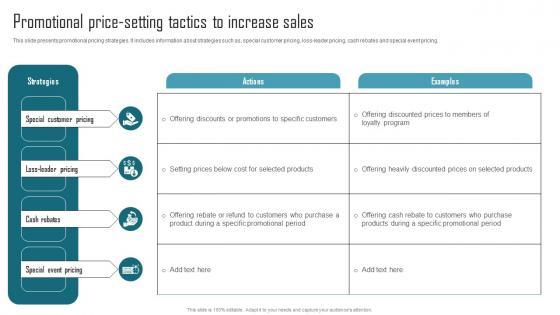 This slide presents promotional pricing strategies. It includes information about strategies such as, special customer pricing, loss-leader pricing, cash rebates and special event pricing. There are so many reasons you need a Effective Product Adaptation Promotional Price Setting Tactics To Increase Sales Themes Pdf The first reason is you can not spend time making everything from scratch, Thus, Slidegeeks has made presentation templates for you too. You can easily download these templates from our website easily. This slide presents promotional pricing strategies. It includes information about strategies such as, special customer pricing, loss-leader pricing, cash rebates and special event pricing.