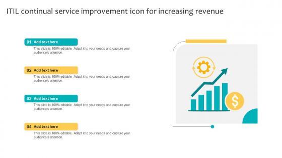 Showcasing this set of slides titled ITIL Continual Service Improvement Icon For Increasing Revenue Ideas Pdf. The topics addressed in these templates are Continual Service Improvement, Increasing Revenue. All the content presented in this PPT design is completely editable. Download it and make adjustments in color, background, font etc. as per your unique business setting. Our ITIL Continual Service Improvement Icon For Increasing Revenue Ideas Pdf are topically designed to provide an attractive backdrop to any subject. Use them to look like a presentation pro.