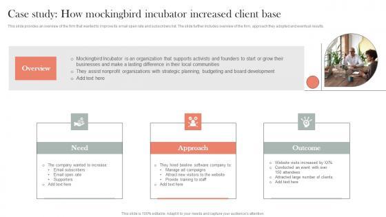 This slide provides an overview of the firm that wanted to improve its email open rate and subscribers list. The slide further includes overview of the firm, approach they adopted and eventual results.From laying roadmaps to briefing everything in detail, our templates are perfect for you. You can set the stage with your presentation slides. All you have to do is download these easy-to-edit and customizable templates. Case Study How Mockingbird Incubator Increased Client Base Efficient Nonprofit Marketing Topics Pdf will help you deliver an outstanding performance that everyone would remember and praise you for. Do download this presentation today. This slide provides an overview of the firm that wanted to improve its email open rate and subscribers list. The slide further includes overview of the firm, approach they adopted and eventual results.