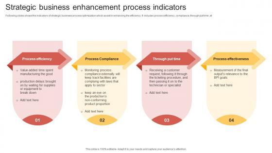 Following slides shows the indicators of strategic business process optimization which assist in enhancing the efficiency. It includes process efficiency, compliance, through put time ,et Pitch your topic with ease and precision using this Strategic Business Enhancement Process Indicators Inspiration Pdf. This layout presents information on Process Efficiency, Process Compliance, Process Effectiveness. It is also available for immediate download and adjustment. So, changes can be made in the color, design, graphics or any other component to create a unique layout. Following slides shows the indicators of strategic business process optimization which assist in enhancing the efficiency. It includes process efficiency, compliance, through put time ,et