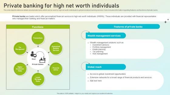 This slide depicts extensive details about private banks which can be used by high net worth individuals to get personalized banking services. It also includes information regarding features and functions of private banks. If you are looking for a format to display your unique thoughts, then the professionally designed Beginners Guide To Commercial Private Banking For High Net Worth Individuals Fin SS V is the one for you. You can use it as a Google Slides template or a PowerPoint template. Incorporate impressive visuals, symbols, images, and other charts. Modify or reorganize the text boxes as you desire. Experiment with shade schemes and font pairings. Alter, share or cooperate with other people on your work. Download Beginners Guide To Commercial Private Banking For High Net Worth Individuals Fin SS V and find out how to give a successful presentation. Present a perfect display to your team and make your presentation unforgettable. This slide depicts extensive details about private banks which can be used by high net worth individuals to get personalized banking services. It also includes information regarding features and functions of private banks.