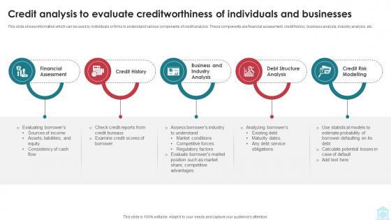 This slide shows information which can be used by individuals or firms to understand various components of credit analysis. These components are financial assessment, credit history, business analysis, industry analysis, etc. Whether you have daily or monthly meetings, a brilliant presentation is necessary. Credit Analysis To Evaluate Creditworthiness Of Individuals Mastering Investment Banking Fin SS V can be your best option for delivering a presentation. Represent everything in detail using Credit Analysis To Evaluate Creditworthiness Of Individuals Mastering Investment Banking Fin SS V and make yourself stand out in meetings. The template is versatile and follows a structure that will cater to your requirements. All the templates prepared by Slidegeeks are easy to download and edit. Our research experts have taken care of the corporate themes as well. So, give it a try and see the results. This slide shows information which can be used by individuals or firms to understand various components of credit analysis. These components are financial assessment, credit history, business analysis, industry analysis, etc.