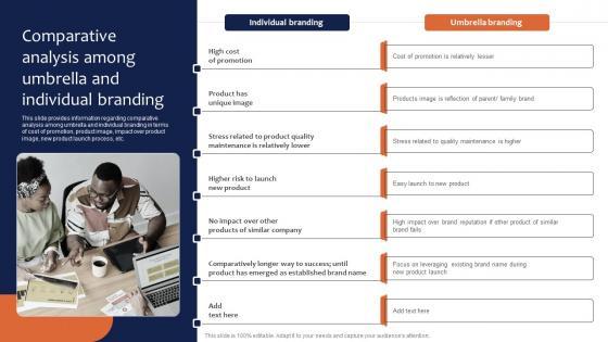 This slide provides information regarding comparative analysis among umbrella and individual branding in terms of cost of promotion, product image, impact over product image, new product launch process, etc. From laying roadmaps to briefing everything in detail, our templates are perfect for you. You can set the stage with your presentation slides. All you have to do is download these easy-to-edit and customizable templates. Comparative Analysis Among Umbrella And Individual Effective Brand Maintenance Professional Pdf will help you deliver an outstanding performance that everyone would remember and praise you for. Do download this presentation today. This slide provides information regarding comparative analysis among umbrella and individual branding in terms of cost of promotion, product image, impact over product image, new product launch process, etc.
