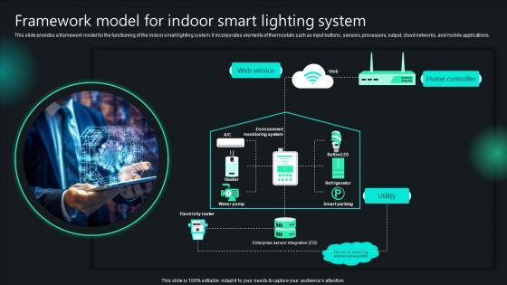 This slide provides a framework model for the functioning of the indoor smart lighting system. It incorporates elements of thermostats such as input buttons, sensors, processors, output, cloud networks, and mobile applications. This modern and well-arranged Unlocking Potential IoTs Application Framework Model For Indoor Smart Lighting System IoT SS V provides lots of creative possibilities. It is very simple to customize and edit with the Powerpoint Software. Just drag and drop your pictures into the shapes. All facets of this template can be edited with Powerpoint, no extra software is necessary. Add your own material, put your images in the places assigned for them, adjust the colors, and then you can show your slides to the world, with an animated slide included. This slide provides a framework model for the functioning of the indoor smart lighting system. It incorporates elements of thermostats such as input buttons, sensors, processors, output, cloud networks, and mobile applications.