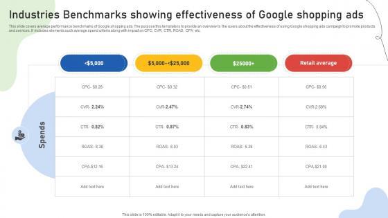 This slide covers average performance benchmarks of Google shopping ads. The purpose this template is to provide an overview to the users about the effectiveness of using Google shopping ads campaign to promote products and services. It includes elements such average spend criteria along with impact on CPC, CVR, CTR, ROAS, CPA, etc. There are so many reasons you need a Google Ads Categories Industries Benchmarks Showing Effectiveness Of Google Shopping MKT SS V. The first reason is you can not spend time making everything from scratch, Thus, Slidegeeks has made presentation templates for you too. You can easily download these templates from our website easily. This slide covers average performance benchmarks of Google shopping ads. The purpose this template is to provide an overview to the users about the effectiveness of using Google shopping ads campaign to promote products and services. It includes elements such average spend criteria along with impact on CPC, CVR, CTR, ROAS, CPA, etc.