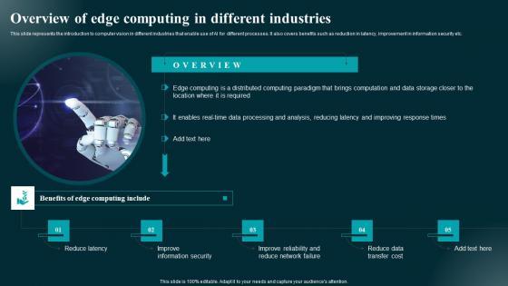 This slide represents the introduction to computer vision in different industries that enable use of AI for different processes. It also covers benefits such as reduction in latency, improvement in information security etc. Find a pre-designed and impeccable Overview Of Edge Computing In Different Industries Applications And Impact Themes Pdf. The templates can ace your presentation without additional effort. You can download these easy-to-edit presentation templates to make your presentation stand out from others. So, what are you waiting for Download the template from Slidegeeks today and give a unique touch to your presentation. This slide represents the introduction to computer vision in different industries that enable use of AI for different processes. It also covers benefits such as reduction in latency, improvement in information security etc.