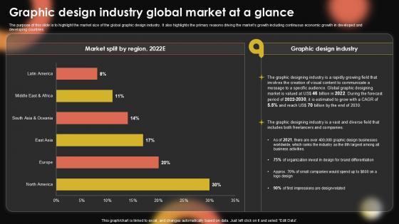 The purpose of this slide is to highlight the graphic design market size which includes the world map with largest market and fastest-growing market. It also includes the visual assets used by graphic designers. Crafting an eye-catching presentation has never been more straightforward. Let your presentation shine with this tasteful yet straightforward Graphic Design Industry Market Split Sample Pentagram Business Plan PPT PowerPoint BP SS V template. It offers a minimalistic and classy look that is great for making a statement. The colors have been employed intelligently to add a bit of playfulness while still remaining professional. Construct the ideal Graphic Design Industry Market Split Sample Pentagram Business Plan PPT PowerPoint BP SS V that effortlessly grabs the attention of your audience Begin now and be certain to wow your customers The purpose of this slide is to highlight the graphic design market size which includes the world map with largest market and fastest-growing market. It also includes the visual assets used by graphic designers.