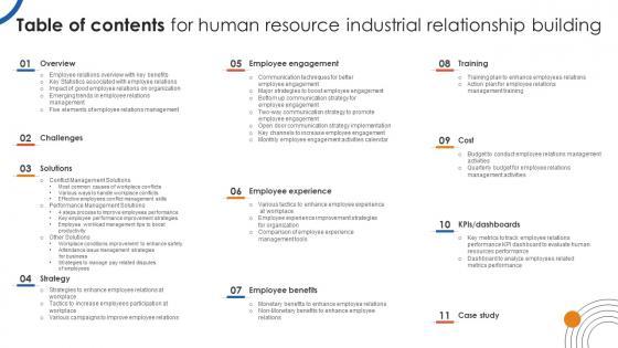 Do you have to make sure that everyone on your team knows about any specific topic I yes, then you should give Table Of Contents Human Resource Industrial Relationship Building a try. Our experts have put a lot of knowledge and effort into creating this impeccable Table Of Contents Human Resource Industrial Relationship Building. You can use this template for your upcoming presentations, as the slides are perfect to represent even the tiniest detail. You can download these templates from the Slidegeeks website and these are easy to edit. So grab these today Our Table Of Contents Human Resource Industrial Relationship Building are topically designed to provide an attractive backdrop to any subject. Use them to look like a presentation pro.