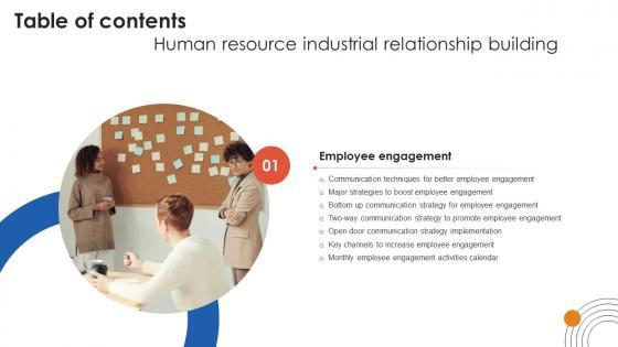 There are so many reasons you need a Table Of Contents For Human Resource Industrial Relationship Building. The first reason is you can not spend time making everything from scratch, Thus, Slidegeeks has made presentation templates for you too. You can easily download these templates from our website easily. Our Table Of Contents For Human Resource Industrial Relationship Building are topically designed to provide an attractive backdrop to any subject. Use them to look like a presentation pro.