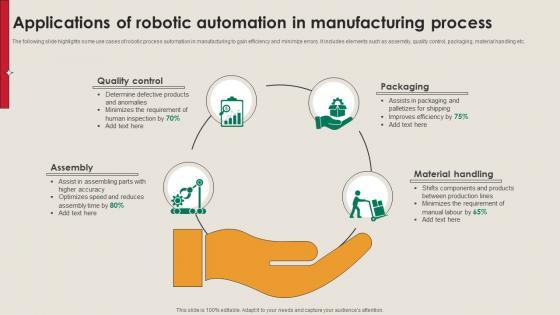 The following slide highlights some use cases of robotic process automation in manufacturing to gain efficiency and minimize errors. It includes elements such as assembly, quality control, packaging, material handling etc. From laying roadmaps to briefing everything in detail, our templates are perfect for you. You can set the stage with your presentation slides. All you have to do is download these easy-to-edit and customizable templates. Applications Of Robotic Automation In Manufacturing Strategy Driving Industry 4 0 will help you deliver an outstanding performance that everyone would remember and praise you for. Do download this presentation today. The following slide highlights some use cases of robotic process automation in manufacturing to gain efficiency and minimize errors. It includes elements such as assembly, quality control, packaging, material handling etc.