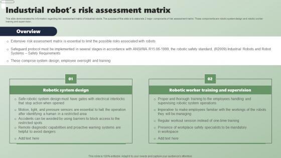 This slide demonstrates the information regarding risk assessment matrix of industrial robots. The purpose of this slide is to elaborate 2 major components of risk assessment matrix. These components are robotic system design and robotic worker training and supervision. Explore a selection of the finest Industrial Robots Risk Assessment Matrix Applications Of Industrial Robots Download Pdf here. With a plethora of professionally designed and pre-made slide templates, you can quickly and easily find the right one for your upcoming presentation. You can use our Industrial Robots Risk Assessment Matrix Applications Of Industrial Robots Download Pdf to effectively convey your message to a wider audience. Slidegeeks has done a lot of research before preparing these presentation templates. The content can be personalized and the slides are highly editable. Grab templates today from Slidegeeks. This slide demonstrates the information regarding risk assessment matrix of industrial robots. The purpose of this slide is to elaborate 2 major components of risk assessment matrix. These components are robotic system design and robotic worker training and supervision.