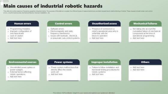 This slide shows the reasons of hazards caused by industrial robots. The purpose of this slide is to explain the different types of reasons behind any accident caused due to malfunctioning of robots. These causes include human and control errors, unauthorized access, mechanical failures, improper installation, etc. The Main Causes Of Industrial Robotic Hazards Applications Of Industrial Robots Inspiration Pdf is a compilation of the most recent design trends as a series of slides. It is suitable for any subject or industry presentation, containing attractive visuals and photo spots for businesses to clearly express their messages. This template contains a variety of slides for the user to input data, such as structures to contrast two elements, bullet points, and slides for written information. Slidegeeks is prepared to create an impression. This slide shows the reasons of hazards caused by industrial robots. The purpose of this slide is to explain the different types of reasons behind any accident caused due to malfunctioning of robots. These causes include human and control errors, unauthorized access, mechanical failures, improper installation, etc.