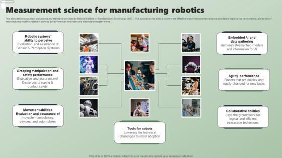 This slide demonstrates test procedures and standards provided by National Institute of Standards and Technology NIST. The purpose of this slide is to show the effectiveness of measurement science activities to improve the performance, and safety of manufacturing robotic systems in order to boost American innovation and industrial competitiveness. Slidegeeks has constructed Measurement Science For Manufacturing Robotics Applications Of Industrial Robots Summary Pdf after conducting extensive research and examination. These presentation templates are constantly being generated and modified based on user preferences and critiques from editors. Here, you will find the most attractive templates for a range of purposes while taking into account ratings and remarks from users regarding the content. This is an excellent jumping-off point to explore our content and will give new users an insight into our top-notch PowerPoint Templates. This slide demonstrates test procedures and standards provided by National Institute of Standards and Technology NIST. The purpose of this slide is to show the effectiveness of measurement science activities to improve the performance, and safety of manufacturing robotic systems in order to boost American innovation and industrial competitiveness.
