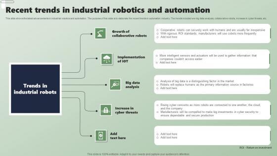 This slide shows the latest advancements in industrial robotics and automation. The purpose of this slide is to elaborate the recent trends in automation industry. The trends included are big data analysis, collaborative robots, increase in cyber threats, etc. This Recent Trends In Industrial Robotics And Automation Applications Of Industrial Robots Diagrams Pdf from Slidegeeks makes it easy to present information on your topic with precision. It provides customization options, so you can make changes to the colors, design, graphics, or any other component to create a unique layout. It is also available for immediate download, so you can begin using it right away. Slidegeeks has done good research to ensure that you have everything you need to make your presentation stand out. Make a name out there for a brilliant performance. This slide shows the latest advancements in industrial robotics and automation. The purpose of this slide is to elaborate the recent trends in automation industry. The trends included are big data analysis, collaborative robots, increase in cyber threats, etc.