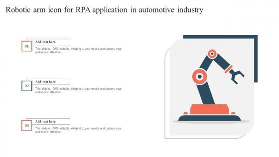 Showcasing this set of slides titled Robotic ARM Icon For RPA Application In Automotive Industry Download Pdf. The topics addressed in these templates are Robotic ARM Icon, RPA Application, Automotive Industry. All the content presented in this PPT design is completely editable. Download it and make adjustments in color, background, font etc. as per your unique business setting. Our Robotic ARM Icon For RPA Application In Automotive Industry Download Pdf are topically designed to provide an attractive backdrop to any subject. Use them to look like a presentation pro.