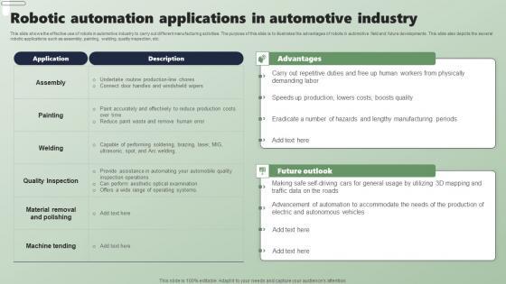 This slide shows the effective use of robots in automotive industry to carry out different manufacturing activities. The purpose of this slide is to illustrates the advantages of robots in automotive field and future developments. This slide also depicts the several robotic applications such as assembly, painting, welding, quality inspection, etc. Here you can discover an assortment of the finest PowerPoint and Google Slides templates. With these templates, you can create presentations for a variety of purposes while simultaneously providing your audience with an eye-catching visual experience. Download Industrial Robots System Robotic Automation Applications In Automotive Industry Designs PDF to deliver an impeccable presentation. These templates will make your job of preparing presentations much quicker, yet still, maintain a high level of quality. Slidegeeks has experienced researchers who prepare these templates and write high-quality content for you. Later on, you can personalize the content by editing the Industrial Robots System Robotic Automation Applications In Automotive Industry Designs PDF.