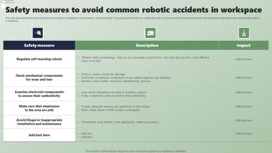 This slide demonstrates the basic precautions to be taken in industries to avoid common robotic accidents. The purpose of this slide is to explain the way in which we can avoid robotic hazards by following some fundamental rules while operating robots in industries. Slidegeeks is one of the best resources for PowerPoint templates. You can download easily and regulate Safety Measures To Avoid Common Robotic Applications Of Industrial Robots Demonstration Pdf for your personal presentations from our wonderful collection. A few clicks is all it takes to discover and get the most relevant and appropriate templates. Use our Templates to add a unique zing and appeal to your presentation and meetings. All the slides are easy to edit and you can use them even for advertisement purposes. This slide demonstrates the basic precautions to be taken in industries to avoid common robotic accidents. The purpose of this slide is to explain the way in which we can avoid robotic hazards by following some fundamental rules while operating robots in industries.
