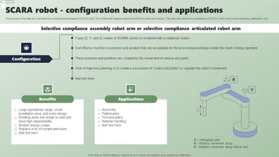 The purpose of this slide is to represent the working and advantages of SCARA robot. The configuration diagram depicts the different robotic arm motions. this slide also outlines key applications of SCARA robot which include assembly, palletization, etc. Retrieve professionally designed Types Of Robots For Industrial Operations SCARA Robot Configuration Benefits And Applications Guidelines PDF to effectively convey your message and captivate your listeners. Save time by selecting pre-made slideshows that are appropriate for various topics, from business to educational purposes. These themes come in many different styles, from creative to corporate, and all of them are easily adjustable and can be edited quickly. Access them as PowerPoint templates or as Google Slides themes. You do not have to go on a hunt for the perfect presentation because Slidegeeks got you covered from everywhere.