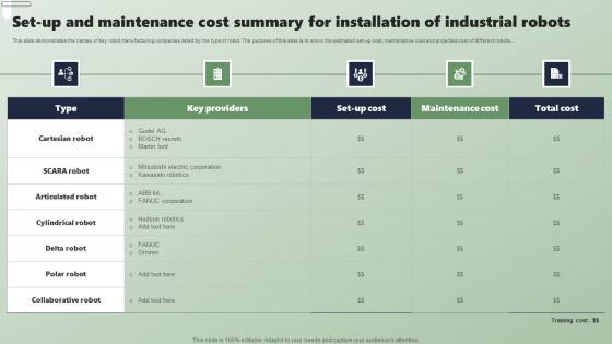 This slide demonstrates the names of key robot manufacturing companies listed by the type of robot. The purpose of this slide is to show the estimated set-up cost, maintenance cost and projected cost of different robots. There are so many reasons you need a Set Up And Maintenance Cost Summary For Applications Of Industrial Robots Professional Pdf. The first reason is you can not spend time making everything from scratch, Thus, Slidegeeks has made presentation templates for you too. You can easily download these templates from our website easily. This slide demonstrates the names of key robot manufacturing companies listed by the type of robot. The purpose of this slide is to show the estimated set-up cost, maintenance cost and projected cost of different robots.