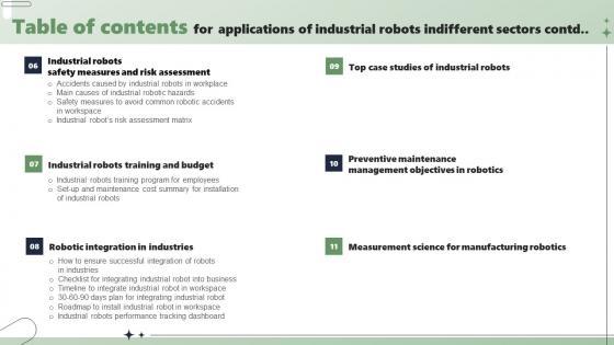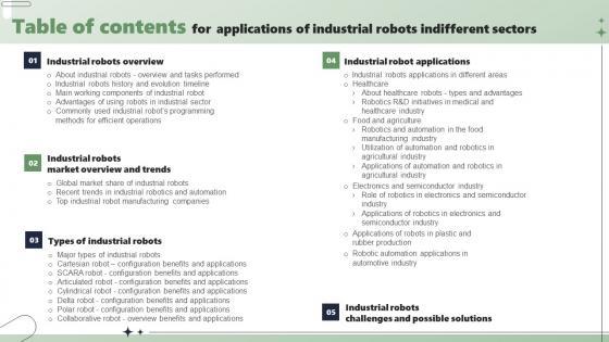 Retrieve professionally designed Table Of Contents Applications Of Robotic Automation In Industries Template PDF to effectively convey your message and captivate your listeners. Save time by selecting pre-made slideshows that are appropriate for various topics, from business to educational purposes. These themes come in many different styles, from creative to corporate, and all of them are easily adjustable and can be edited quickly. Access them as PowerPoint templates or as Google Slides themes. You do not have to go on a hunt for the perfect presentation because Slidegeeks got you covered from everywhere.